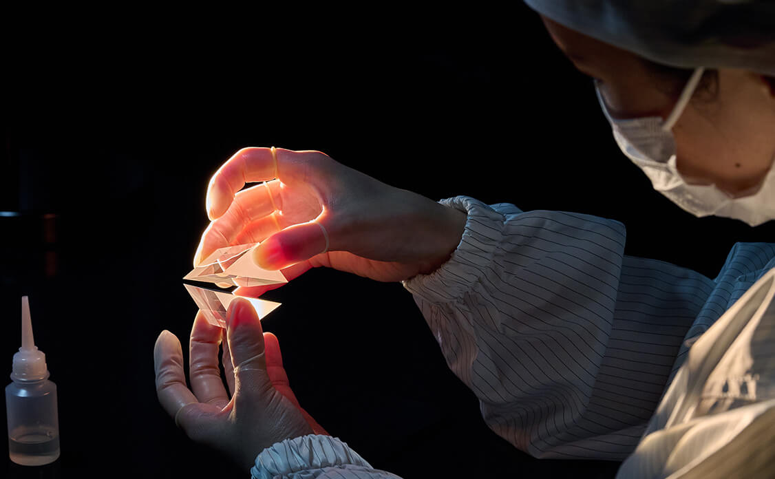 NITTO OPTICAL selects adhesives suitable for the material and product specification. NITTO OPTICAL measures the beam deviation accuracy and spectral characteristics with measuring instruments.