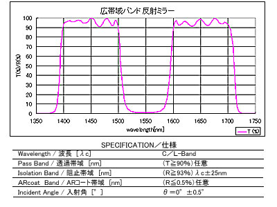 広帯域バンド反射ミラーは、特定波長帯域を反射します。チューナブルレーザー等のレーザー共振器用途などに使用されます。