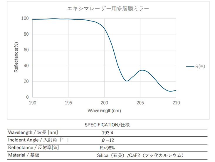 エキシマレーザー用多層膜ミラーは、紫外波長に対応するため、誘電体多層膜を用いたミラーが使用されます。高反射率と耐レーザー性が求められます。