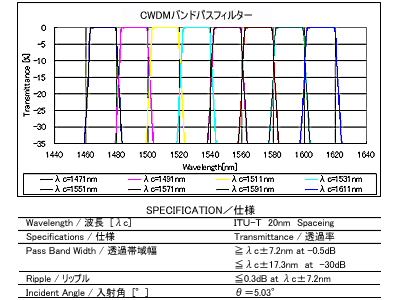 CWDMバンドパスフィルターは、CWDM光通信用途にて使用するバンドパスフィルターで、 使用波長帯域が20nm間隔の場合、透過帯域は14nm以上と広く、かつリップルを抑えます。