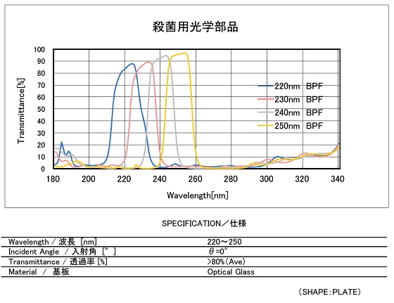 殺菌用光学部品は、人体に害を及ぼすことなく、コロナウイルスを殺菌する効果がある220~250nm付近の波長に対応しており、日東光器は膜設計および製作が可能です。