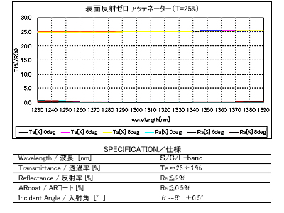 表面無反射アッテネーターは、任意の光量減衰(25%や50%など)を行いながら、表面反射を無くした光学素子です。