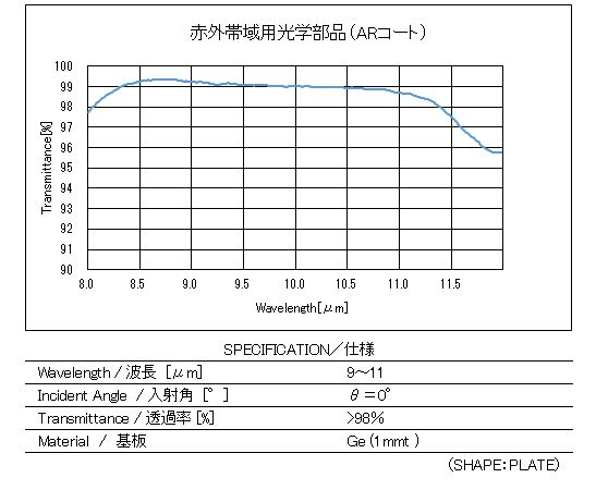 赤外帯域用光学部品(ARコート)は、赤外帯域用に設計された反射防止膜をコーティングした光学素子です。赤外線を用いたアプリケーションに幅広く応用する事が可能です。