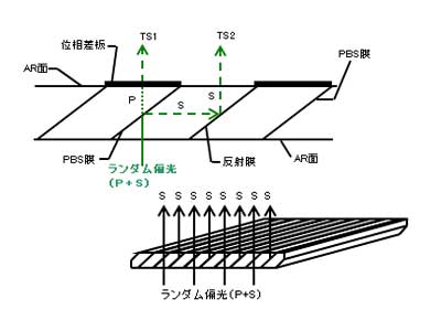 ポラライジングコンバーター(PLC)は、液晶プロジェクター用途では、入射ランダム偏光を一定の偏光方向にそろえる偏光変換素子です。入射光は、偏光ビームスプリッタープリズムを通過後P偏光とS偏光に分岐されます、その後、光の効率を上げるためP偏光、S偏光どちらかの成分のみ1/2波長板を通過させ一定方向の偏光成分にそろえることでポラライジングコンバーターを構成します。