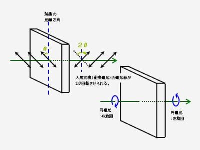 波長板は、偏光を制御するために使用される光学素子です。1/2波長板や1/4波長板などがあります。