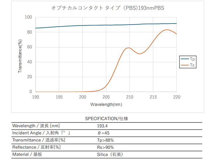 オプチカルコンタクトタイプ偏光ビームスプリッター(PBS)は、接着剤を使用せずに接合されたPBS プリズムです。レーザー高出力環境でも透過率の低下を防止します。接着層による紫外光の吸収がないため、紫外域での高透過率と長期信頼性を実現しています。