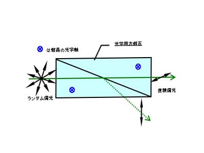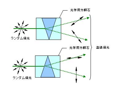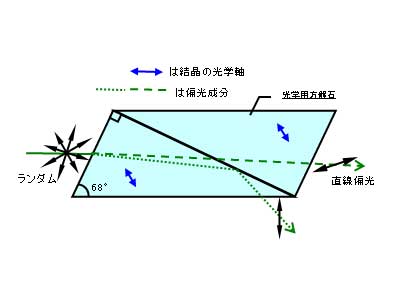 ニコルプリズムは、複屈折をもつ2つの方解石を接合して入射自然光を直線偏光にする偏光プリズムです。
